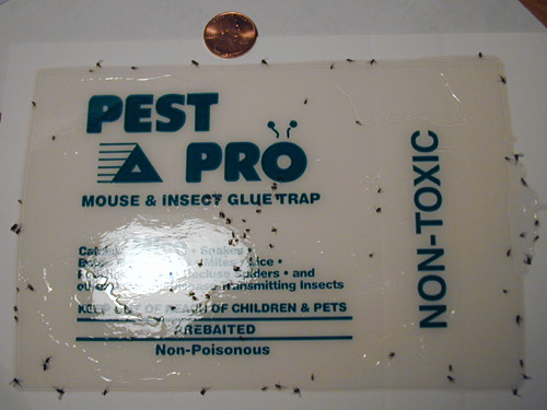 The exterminator left these glue traps for me to use. Their killing efficiency pales by comparison to my lamp and bowl of water setup.